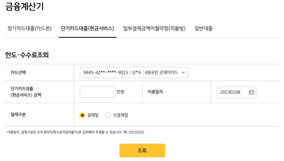 단기카드대출(현금서비스) 이용한도는 월 기준으로, 이번달 이용금액에 관계없이 카드 결제일 다음날 복원 |