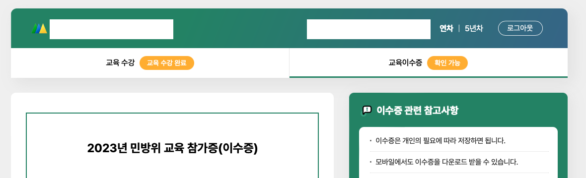 모두 완료하게 되면 교육 이수증을 다운받을 수 있습니다.